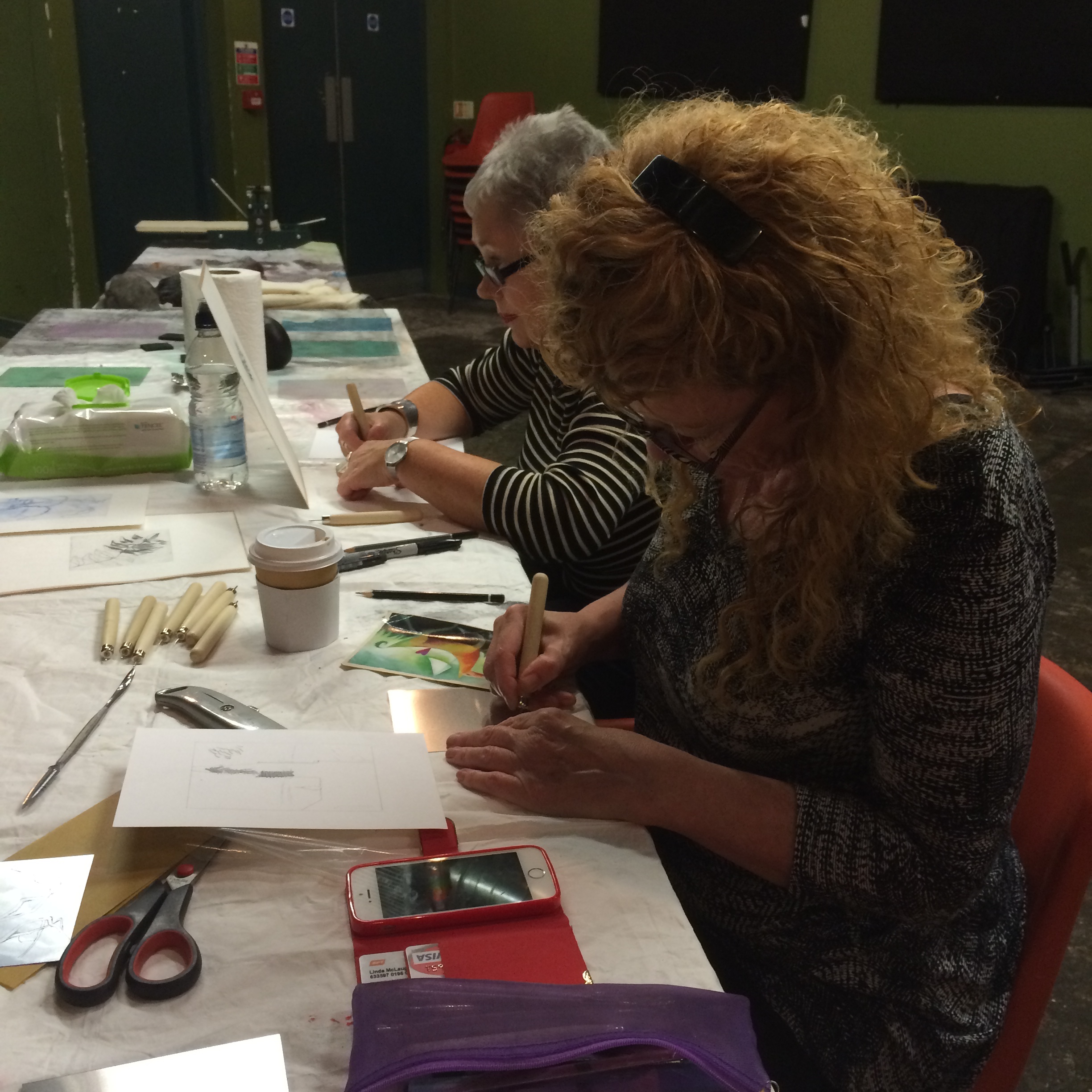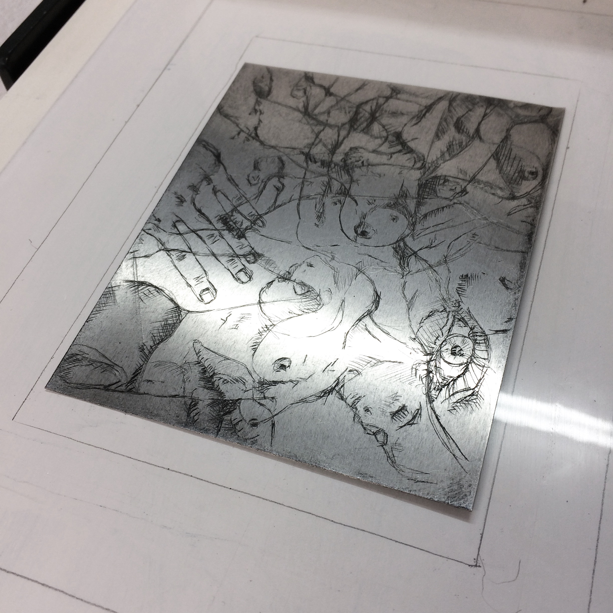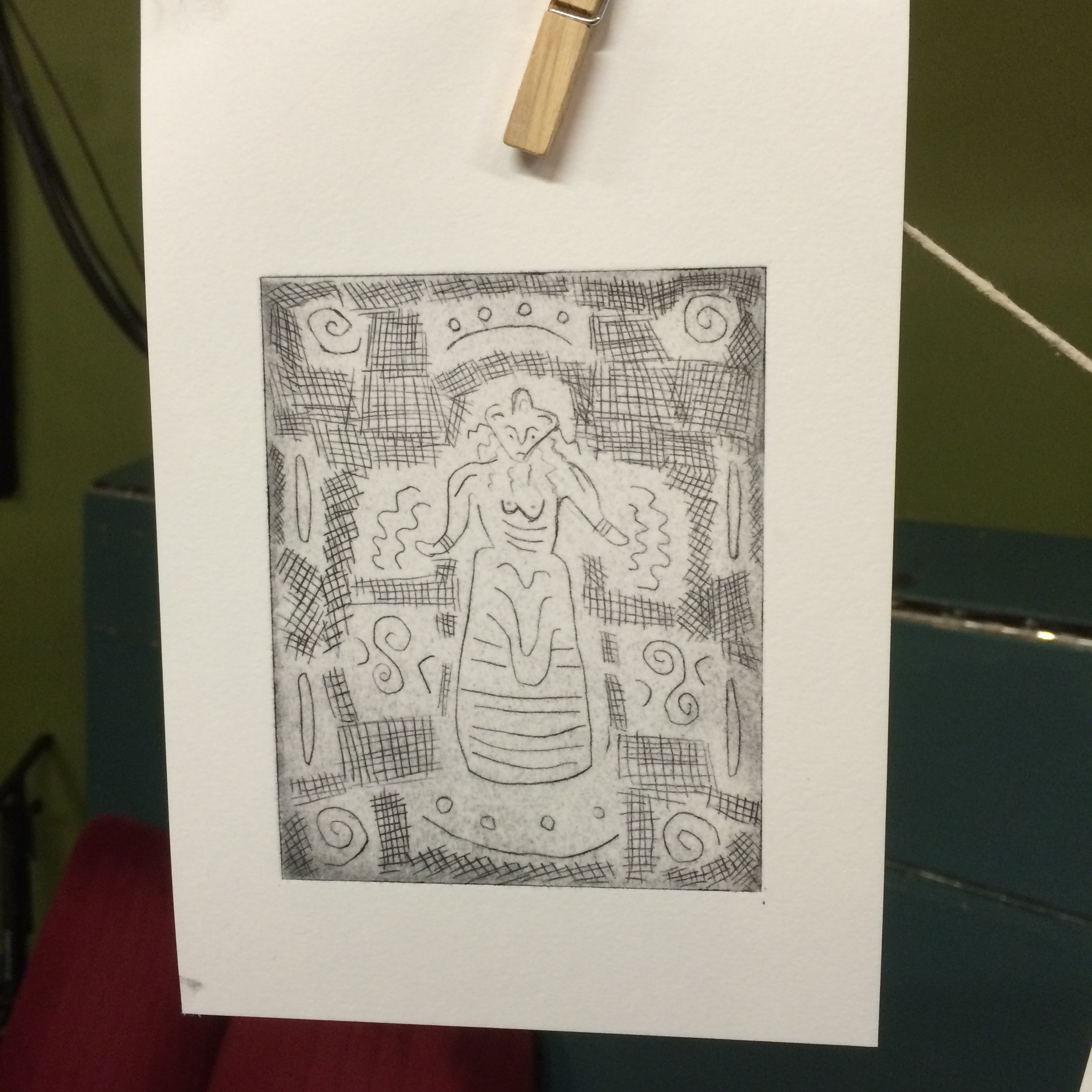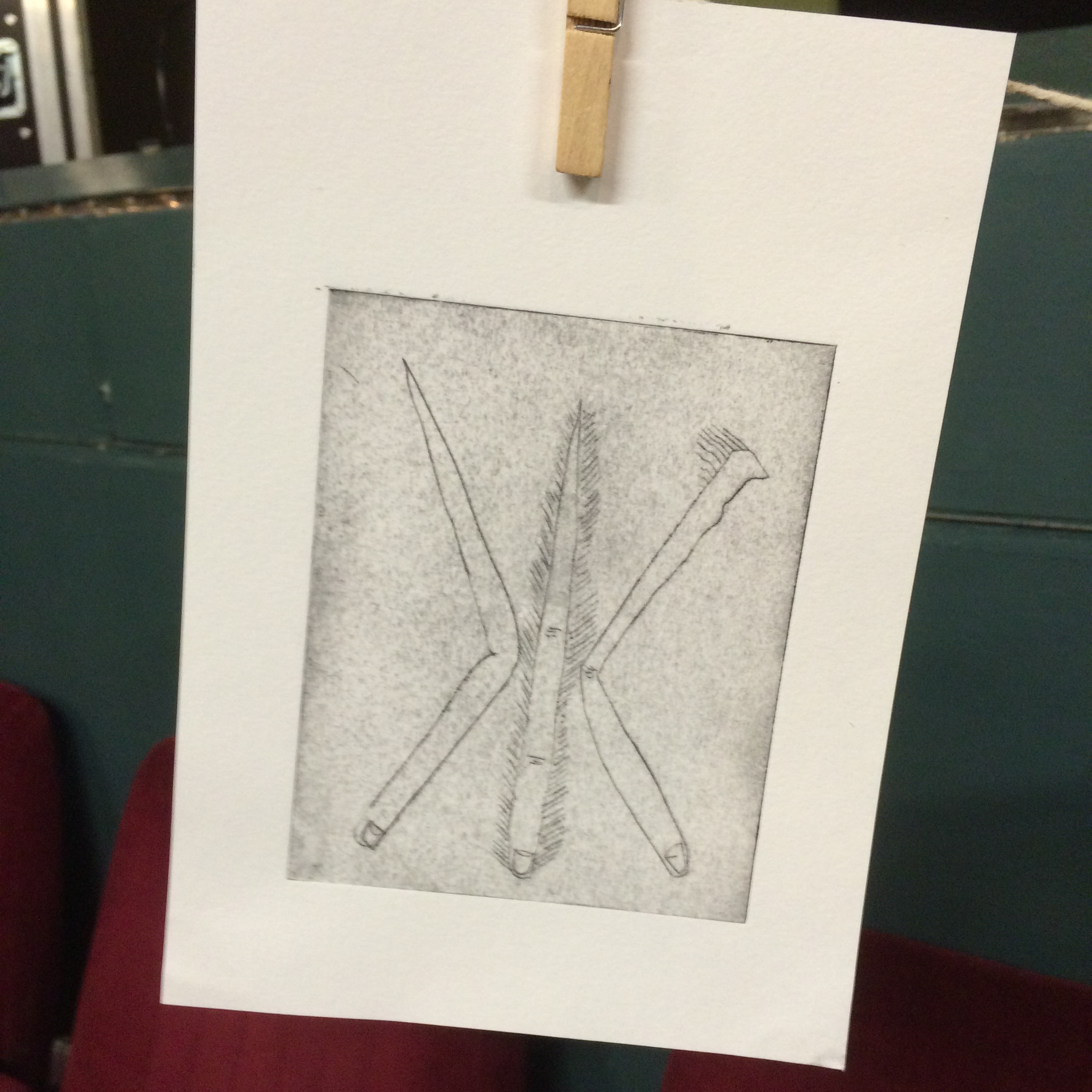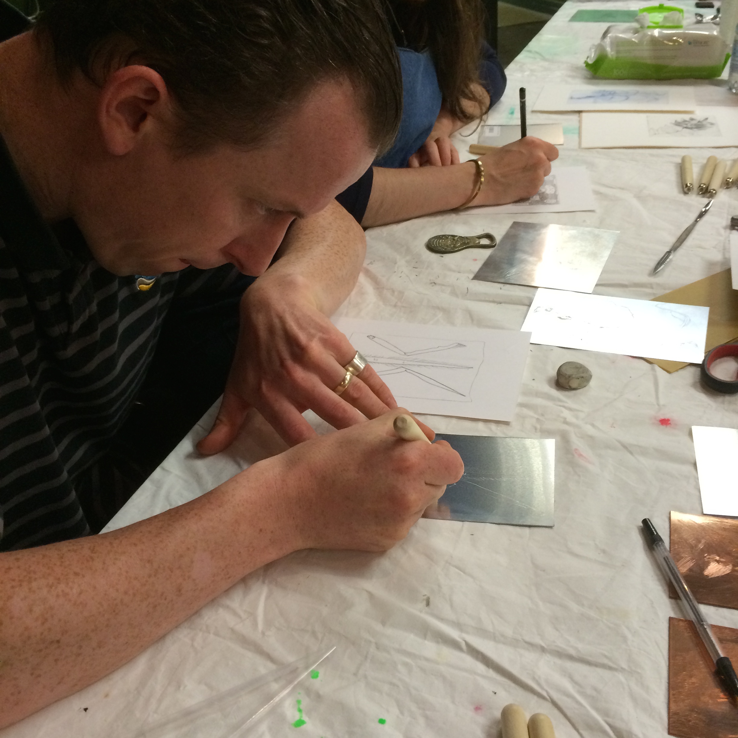Drypoint Etching is an intaglio method of printing, involving engraving a drawing into the surface of a smooth plate. This is traditionally copper or steel, but can also be a sheet of plastic. Using a series of tools, such as needle points and pattern making roulette wheels, a design is scratched out manually. You can vary the density of the lines by applying varying degrees of pressure, or build up tones through crosshatching. A sticky ink is then applied to the plate, dabbed down into the marks made, and the excess wiped away with a soft cloth. Damp paper is then laid on top of the plate and both are run through a press to take an accurate impression, which in this case prints in reverse. You can view our upcoming classes here.